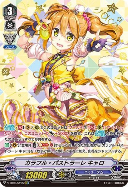 【自】【(V)】:登場時、【コスト】[【ソウルブラスト】(2)]することで、あなたの山札から「カラフル・パストラーレ キャロ」を1枚まで探し、公開して手札に加え、山札をシャッフルする。