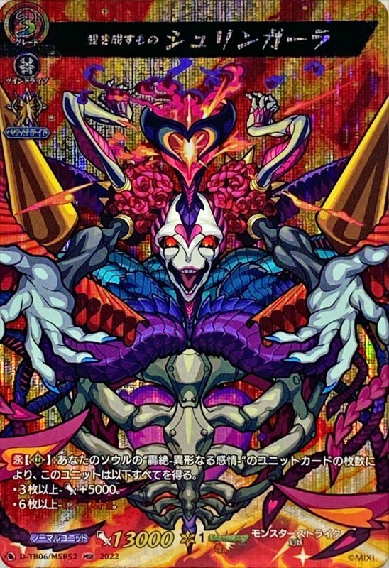 【永】【(R)】:あなたのソウルの“轟絶-異形なる感情-”のユニットカードの枚数により、このユニットは以下すべてを得る。・3枚以上-パワー+5000。・6枚以上-『ブースト』。