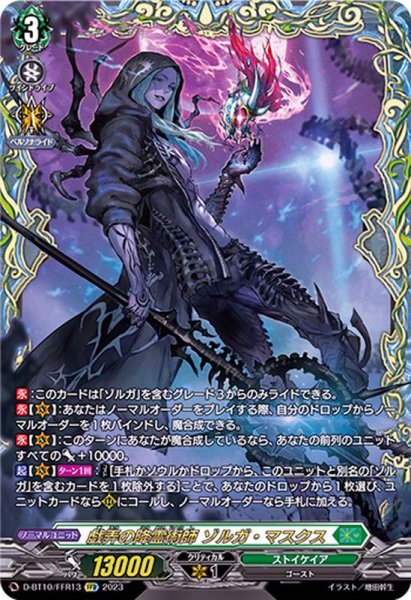 【永】:このカードは「ゾルガ」を含むグレード3からのみライドできる。【永】【(V)】:あなたはノーマルオーダーをプレイする際、自分のドロップからノーマルオーダーを1枚バインドし、魔合成できる。【永】【(V)】:このターンにあなたが魔合成しているなら、あなたの前列のユニットすべてのパワー+10000。【起】【(V)】【ターン1回】:【コスト】[手札かソウルかドロップから、このユニットと別名の「ゾルガ」を含むカードを1枚除外する]ことで、あなたのドロップから1枚選び、ユニットカードなら(R)にコールし、ノーマルオーダーなら手札に加える。