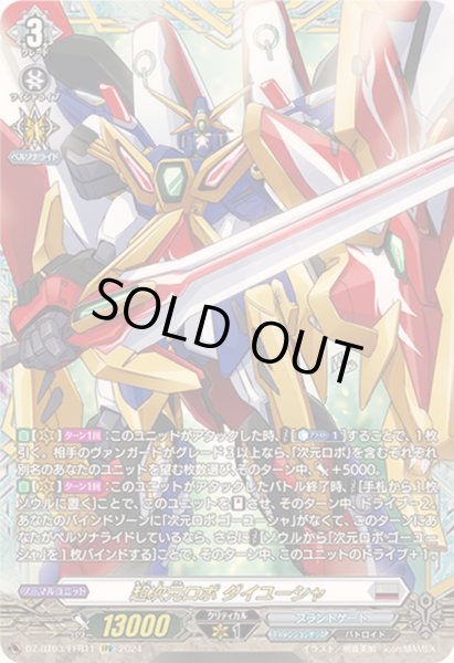 【自】【(V)】【ターン1回】:このユニットがアタックした時、【コスト】[【カウンターブラスト】(1)]することで、1枚引く。相手のヴァンガードがグレード3以上なら、「次元ロボ」を含むそれぞれ別名のあなたのユニットを望む枚数選び、そのターン中、パワー+5000。【自】【(V)】【ターン1回】:このユニットがアタックしたバトル終了時、【コスト】[手札から1枚ソウルに置く]ことで、このユニットを【スタンド】させ、そのターン中、ドライブ-2。あなたのバインドゾーンに「次元ロボ ゴーユーシャ」がなくて、このターンにあなたがペルソナライドしているなら、さらに【コスト】[ソウルから「次元ロボ ゴーユーシャ」を1枚バインドする]ことで、そのターン中、このユニットのドライブ+1。