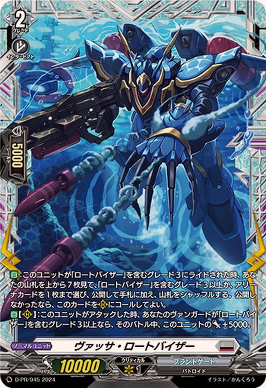 【自】:このユニットが「ロートバイザー」を含むグレード3にライドされた時、あなたの山札を上から7枚見て、「ロートバイザー」を含むグレード3以上か、アリーナカードを1枚まで選び、公開して手札に加え、山札をシャッフルする。公開しなかったなら、このカードを(R)にコールしてよい。【自】【(R)】:このユニットがアタックした時、あなたのヴァンガードが「ロートバイザー」を含むグレード3以上なら、そのバトル中、このユニットのパワー+5000。