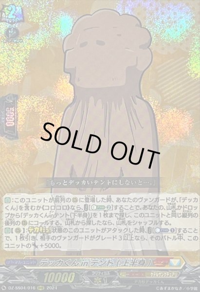 【自】:このユニットが前列の(R)に登場した時、あなたのヴァンガードが、「デッカくん」を含むか《コロコロ》なら、【コスト】[【エネルギーブラスト】(2)]することで、あなたの、山札かドロップから「デッカくんinテント(下半身)」を1枚まで探し、このユニットと同じ縦列の後列の(R)にコールする。山札から探したなら、山札をシャッフルする。【自】【(R)】:【デカ杉っ!】状態のこのユニットがアタックした時、【コスト】[【カウンターブラスト】(1)]することで、1枚引き、相手のヴァンガードがグレード3以上なら、そのバトル中、このユニットのパワー+5000。