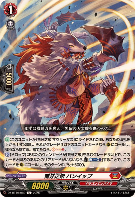 【自】:このユニットが「荒牙之衆 マウリーザス」にライドされた時、あなたの山札を上から1枚公開し、それがグレード3以下のユニットカードなら(R)にコールし、違うなら捨てる。捨てたなら、【ソウルチャージ】(2)。【起】【ドロップ】:あなたのヴァンガードが「荒牙之衆」を含むグレード3以上で、このカードと同名のあなたのリアガードがいないなら、【コスト】[【カウンターブラスト】(1)]することで、このカードを(R)にコールし、そのターン中、パワー+5000。