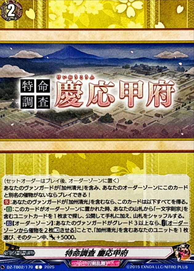 (セットオーダーはプレイ後、オーダーゾーンに置く)あなたのヴァンガードが「加州清光」を含み、あなたのオーダーゾーンにこのカードと別名の催物がないならプレイできる!【永】:あなたのヴァンガードが「加州清光」を含むなら、このカードは以下すべてを得る。・【自】:このカードがオーダーゾーンに置かれた時、あなたの山札から「一文字則宗」を含むユニットカードを1枚まで探し、公開して手札に加え、山札をシャッフルする。・【起】【オーダーゾーン】:あなたのヴァンガードがグレード3以上なら、【コスト】[オーダーゾーンから催物を2枚【レスト】させる]ことで、「加州清光」を含むあなたのユニットを1枚選び、そのターン中、パワー+5000。