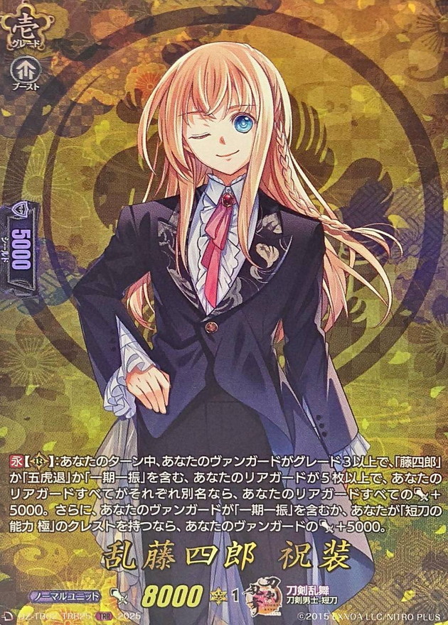 【永】【(R)】:あなたのターン中、あなたのヴァンガードがグレード3以上で、「藤四郎」か「五虎退」か「一期一振」を含む、あなたのリアガードが5枚以上で、あなたのリアガードすべてがそれぞれ別名なら、あなたのリアガードすべてのパワー+5000。さらに、あなたのヴァンガードが「一期一振」を含むか、あなたが「短刀の能力 極」のクレストを持つなら、あなたのヴァンガードのパワー+5000。