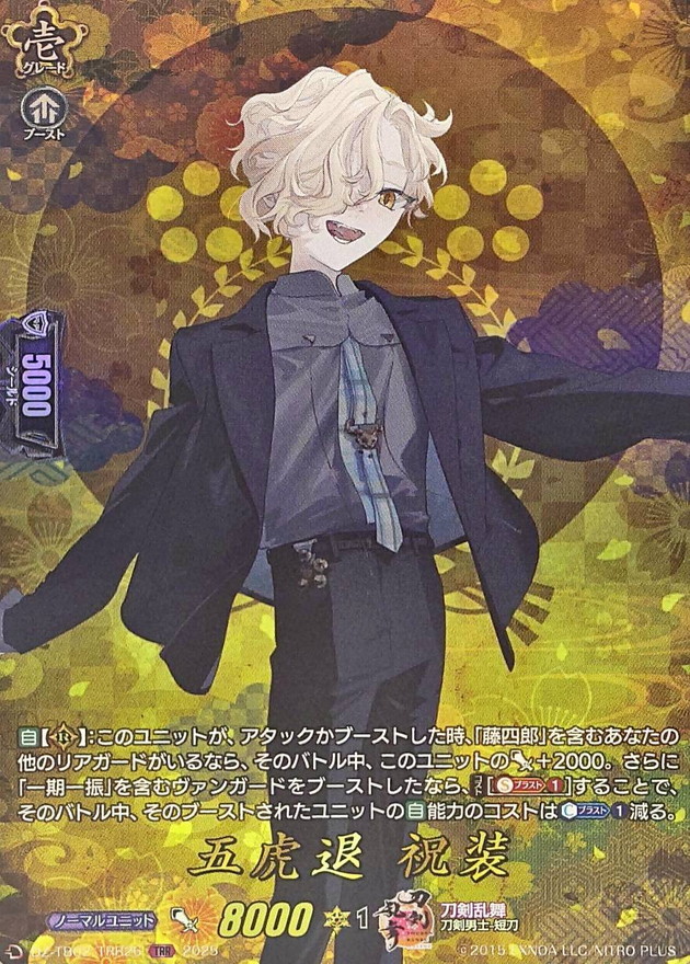 【自】【(R)】:このユニットが、アタックかブーストした時、「藤四郎」を含むあなたの他のリアガードがいるなら、そのバトル中、このユニットのパワー+2000。さらに「一期一振」を含むヴァンガードをブーストしたなら、【コスト】[【ソウルブラスト】(1)]することで、そのバトル中、そのブーストされたユニットの【自】能力のコストは【カウンターブラスト】(1)減る。