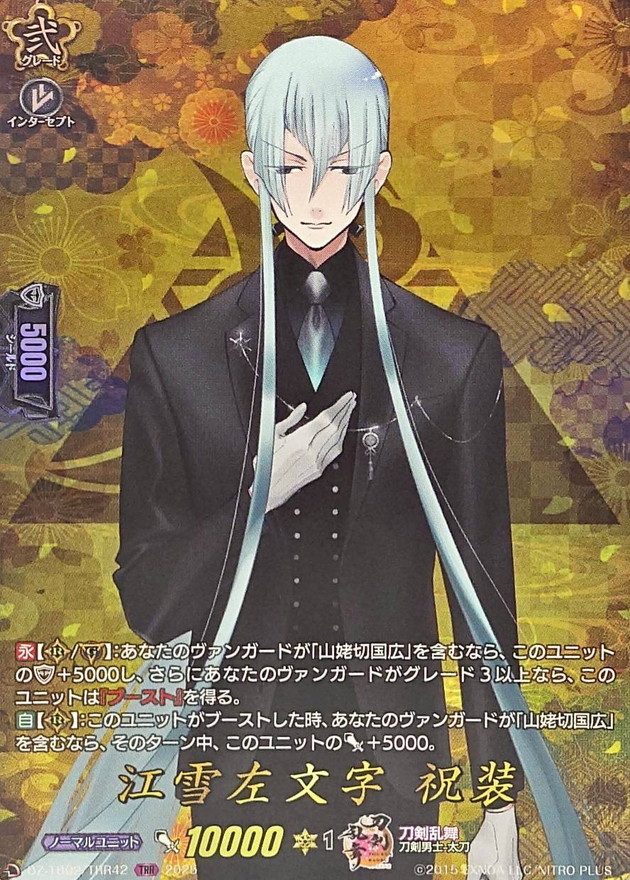 【永】【(R)/(G)】:あなたのヴァンガードが「山姥切国広」を含むなら、このユニットのシールド+5000し、さらにあなたのヴァンガードがグレード3以上なら、このユニットは『ブースト』を得る。【自】【(R)】:このユニットがブーストした時、あなたのヴァンガードが「山姥切国広」を含むなら、そのターン中、このユニットのパワー+5000。