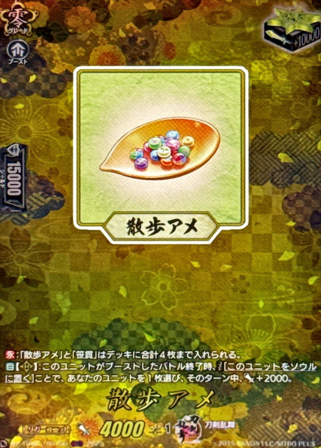 【永】:「散歩アメ」と「笹貫」はデッキに合計4枚まで入れられる。【自】【(R)】:このユニットがブーストしたバトル終了時、【コスト】[このユニットをソウルに置く]ことで、あなたのユニットを1枚選び、そのターン中、パワー+2000。