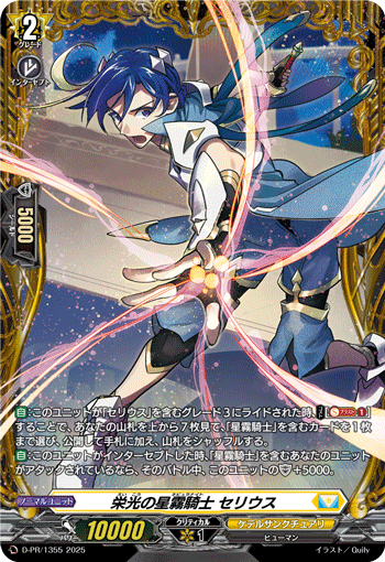 【自】:このユニットが「セリウス」を含むグレード3にライドされた時、【コスト】[【ソウルブラスト】(1)]することで、あなたの山札を上から7枚見て、「星霧騎士」を含むカードを1枚まで選び、公開して手札に加え、山札をシャッフルする。