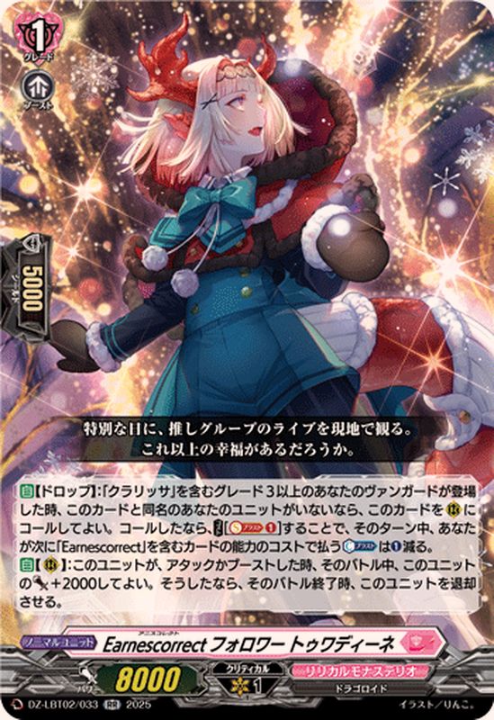 【自】【ドロップ】:「クラリッサ」を含むグレード3以上のあなたのヴァンガードが登場した時、このカードと同名のあなたのユニットがいないなら、このカードを(R)にコールしてよい。コールしたなら、【コスト】[【ソウルブラスト】(1)]することで、そのターン中、あなたが次に「Earnescorrect」を含むカードの能力のコストで払う【カウンターブラスト】は(1)減る。【自】【(R)】:このユニットが、アタックかブーストした時、そのバトル中、このユニットのパワー+2000してよい。そうしたなら、そのバトル終了時、このユニットを退却させる。