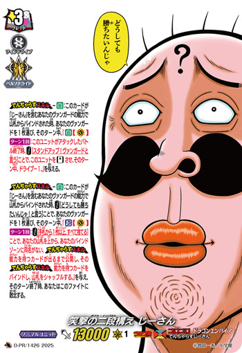 【でんぢゃらすスキル】-【自】:このカードが「じーさん」を含むあなたのヴァンガードの能力で山札からバインドされた時、【コスト】[どうしても勝ちたいんじゃ!と言う]ことで、あなたのヴァンガードを1枚選び、そのターン中、『【起】【(V)】【ターン1回】:【コスト】[手札から1枚以上、すべて捨てる]ことで、あなたの山札を上から、あなたのバインドゾーンに同名がない、【でんぢゃらすスキル】能力を持つカードが出るまで公開し、その【でんぢゃらすスキル】能力を持つカードをバインドし、山札をシャッフルする。』を与え、そのターン終了時、あなたはこのファイトに敗北する。