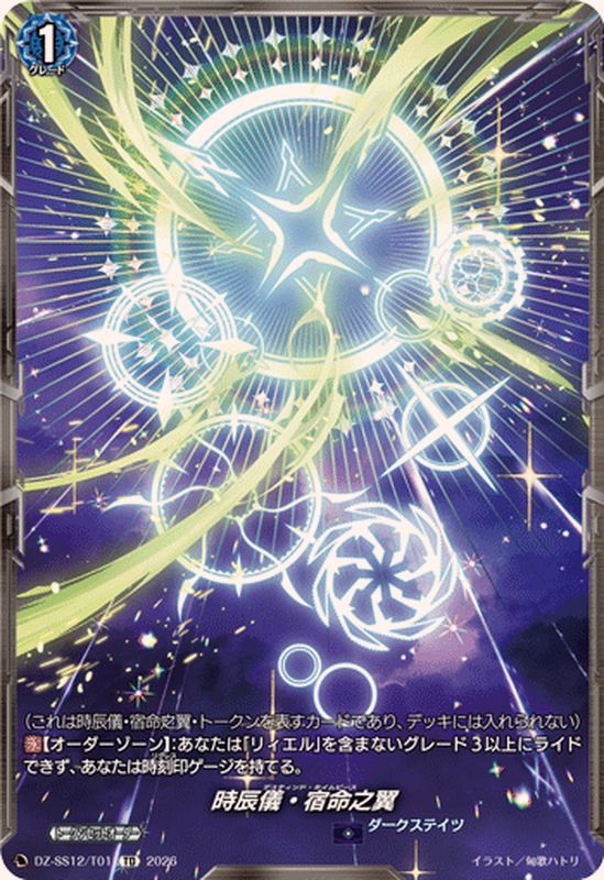 (これは時辰儀・宿命之翼・トークンを表すカードであり、デッキには入れられない)【永】【オーダーゾーン】:あなたは「リィエル」を含まないグレード3以上にライドできず、あなたは時刻印ゲージを持てる。