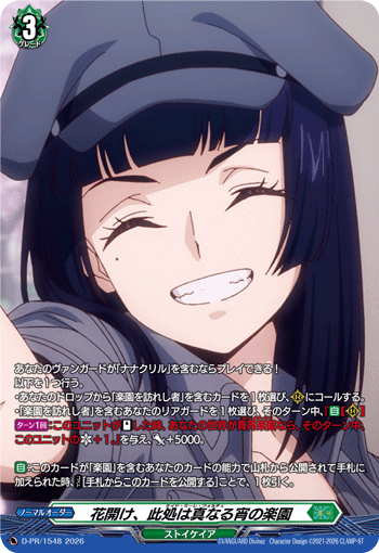 ・「楽園を訪れし者」を含むあなたのリアガードを1枚選び、そのターン中、『【自】【(R)】【ターン1回】:このユニットが【スタンド】した時、あなたの世界が真宵楽園なら、そのターン中、このユニットのクリティカル+1。』を与え、パワー+5000。
