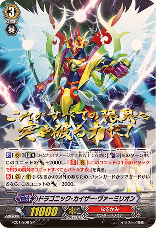 【起】【(V)】【リミットブレイク】(4)(あなたのダメージが4枚以上で有効):[【カウンターブラスト】(3)]そのターン中、このユニットのパワー+2000し、『【永】【(V)】:このユニットは1回のアタックで相手の前列のユニットすべてとバトルする。』を得る。【永】【(V)/(R)】:《なるかみ》以外のあなたの、ヴァンガードかリアガードがいるなら、このユニットのパワー-2000。