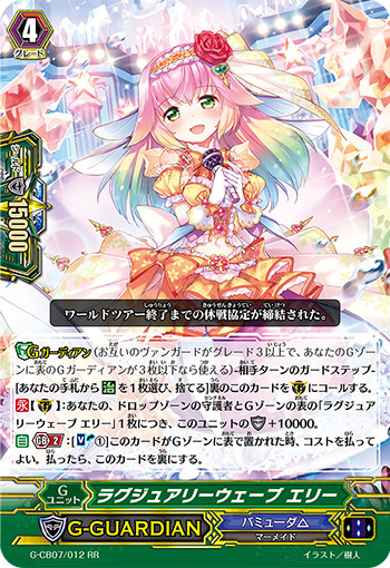 【Gガーディアン】-相手ターンのガードステップ-[あなたの手札から【治】を1枚選び、捨てる]裏のこのカードを(G)にコールする。【永】【(G)】:あなたの、ドロップゾーンの守護者とGゾーンの表の「ラグジュアリーウェーブ エリー」1枚につき、 このユニットのシールド+10000。【自】【Gブレイク】(2):[【ソウルブラスト】(1)]このカードがGゾーンに表で置かれた時、コストを払ってよい。払ったら、このカードを裏にする。