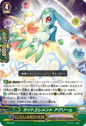 【Gガーディアン】(お互いのヴァンガードがグレード3以上で、あなたのGゾーンの表のGガーディアンが3枚以下なら使える)-相手ターンのガードステップ-[手札から【治】を1枚選び、捨てる]裏のこのカードを(G)に【レスト】でコールする。