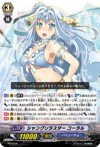 【起】【(V)】【リミットブレイク】(4)(あなたのダメージが4枚以上で有効):[【カウンターブラスト】(1),【ソウルブラスト】(1)]あなたの《バミューダ△》のリアガードを1枚選び、手札に戻し、そのターン中、このユニットのパワー+3000。あなたの手札からカード名に「コーラル」を含むカードを1枚まで選び、ソウルに置いてよい。置いたなら、2枚引く。そのターン中、この能力は使えなくなる。