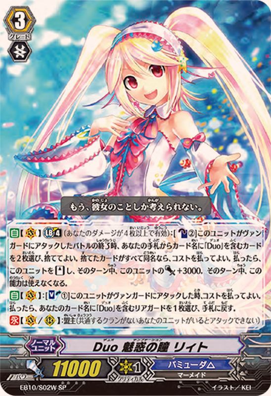 【自】【(V)】【リミットブレイク】(4)(あなたのダメージが4枚以上で有効):[【カウンターブラスト】(2)]このユニットがヴァンガードにアタックしたバトルの終了時、あなたの手札からカード名に「Duo」を含むカードを2枚選び、捨ててよい。捨てたカードがすべて同名なら、コストを払ってよい。払ったら、このユニットを【スタンド】し、そのターン中、このユニットのパワー+3000。そのターン中、この能力は使えなくなる。【自】【(V)】:[【ソウルブラスト】(1)]このユニットがヴァンガードにアタックした時、コストを払ってよい。払ったら、あなたのカード名に「Duo」を含むリアガードを1枚選び、手札に戻す。【永】【(V)/(R)】:盟主(共通するクランがないあなたのユニットがいるとアタックできない)