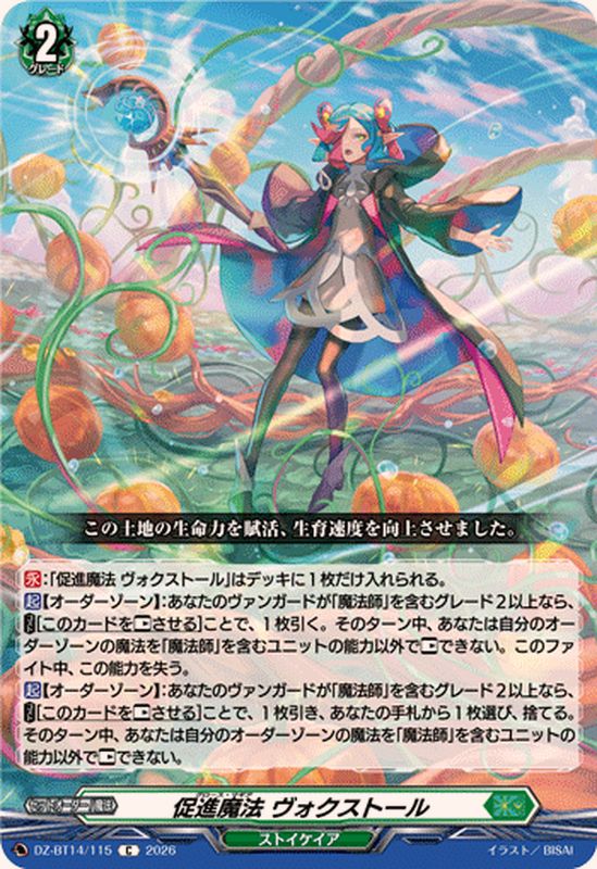 【永】:「促進魔法 ヴォクストール」はデッキに1枚だけ入れられる。【起】【オーダーゾーン】:あなたのヴァンガードが「魔法師」を含むグレード2以上なら、【コスト】[このカードを【レスト】させる]ことで、1枚引く。そのターン中、あなたは自分のオーダーゾーンの魔法を「魔法師」を含むユニットの能力以外で【レスト】できない。このファイト中、この能力を失う。【起】【オーダーゾーン】:あなたのヴァンガードが「魔法師」を含むグレード2以上なら、【コスト】[このカードを【レスト】させる]ことで、1枚引き、あなたの手札から1枚選び、捨てる。そのターン中、あなたは自分のオーダーゾーンの魔法を「魔法師」を含むユニットの能力以外で【レスト】できない。