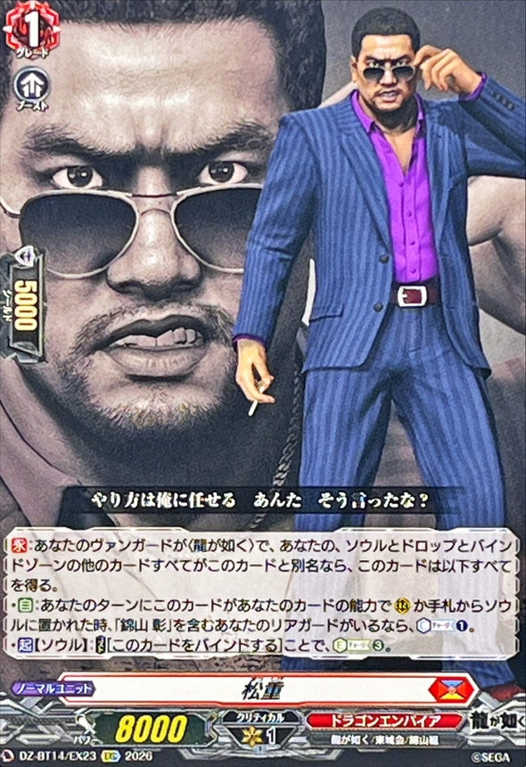 【永】:あなたのヴァンガードが〈龍が如く〉で、あなたの、ソウルとドロップとバインドゾーンの他のカードすべてがこのカードと別名なら、このカードは以下すべてを得る。・【自】:あなたのターンにこのカードがあなたのカードの能力で(R)か手札からソウルに置かれた時、「錦山 彰」を含むあなたのリアガードがいるなら、【カウンターチャージ】(1)。・【起】【ソウル】:【コスト】[このカードをバインドする]ことで、【エネルギーチャージ】(3)。