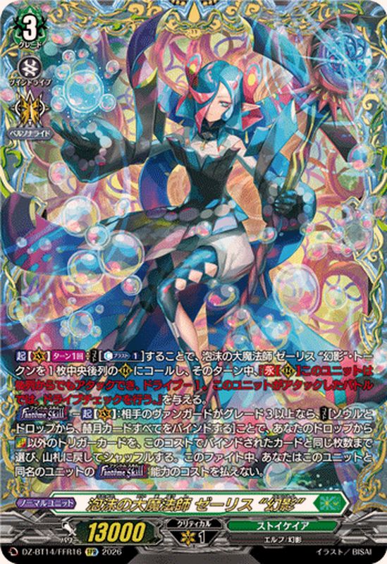 【起】【(V)】【ターン1回】:【コスト】[【カウンターブラスト】(1)]することで、泡沫の大魔法師 ゼーリス “幻影”・トークンを1枚中央後列の(R)にコールし、そのターン中、『【永】【(R)】このユニットは後列からでもアタックでき、ドライブ-1。このユニットがアタックしたバトルでは、ドライブチェックを行う。』を与える。【ファントムスキル】-【起】【(V)】:相手のヴァンガードがグレード3以上なら、【コスト】[ソウルとドロップから、赫月カードすべてをバインドする]ことで、あなたのドロップから【超】以外のトリガーカードを、このコストでバインドされたカードと同じ枚数まで選び、山札に戻してシャッフルする。このファイト中、あなたはこのユニットと同名のユニットの【ファントムスキル】能力のコストを払えない。