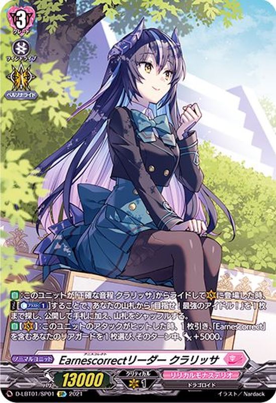 【自】:このユニットが「正確な音程 クラリッサ」からライドして(V)に登場した時、【コスト】[【カウンターブラスト】(1)]することで、あなたの山札から「目指せ!最強のアイドル!」を1枚まで探し、公開して手札に加え、山札をシャッフルする。【自】【(V)】:このユニットのアタックがヒットした時、1枚引き、「Earnescorrect」を含むあなたのリアガードを1枚選び、そのターン中、パワー+5000。