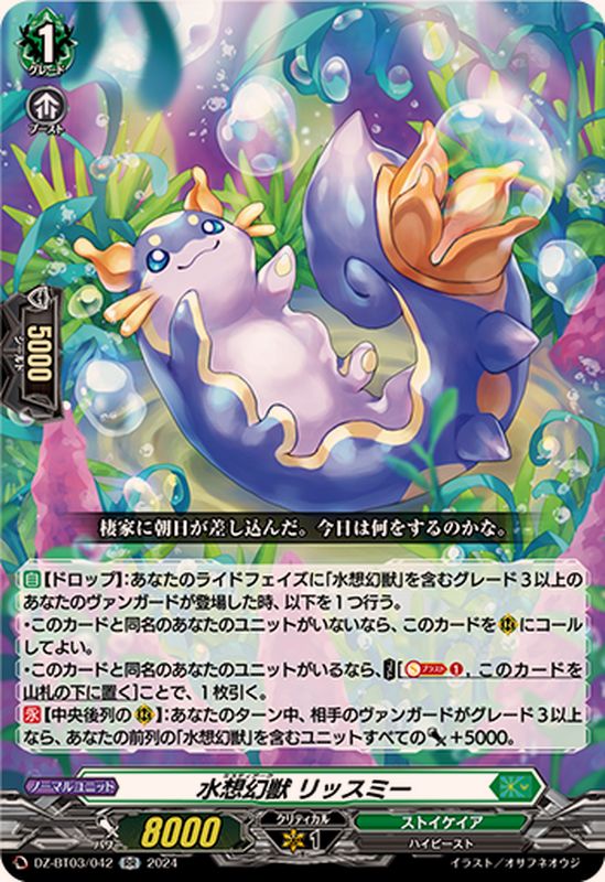 【自】【ドロップ】:あなたのライドフェイズに「水想幻獣」を含むグレード3以上のあなたのヴァンガードが登場した時、以下を1つ行う。・このカードと同名のあなたのユニットがいないなら、このカードを(R)にコールしてよい。・このカードと同名のあなたのユニットがいるなら、【コスト】[【ソウルブラスト】(1),このカードを山札の下に置く]ことで、1枚引く。【永】【中央後列の(R)】:あなたのターン中、相手のヴァンガードがグレード3以上なら、あなたの前列の「水想幻獣」を含むユニットすべてのパワー+5000。