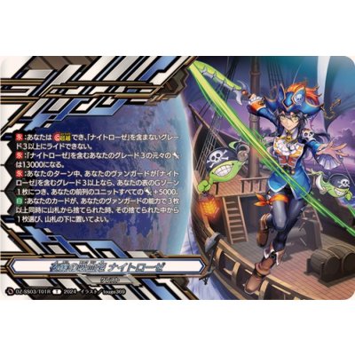 【永】:あなたは【超越】でき、「ナイトローゼ」を含まないグレード3以上にライドできない。【永】:「ナイトローゼ」を含むあなたのグレード3の元々のパワーは13000になる。【永】:あなたのターン中、あなたのヴァンガードが「ナイトローゼ」を含むグレード3以上なら、あなたの表のGゾーン1枚につき、あなたの前列のユニットすべてのパワー+5000。【自】:あなたのカードが、あなたのヴァンガードの能力で3枚以上同時に山札から捨てられた時、その捨てられた中から1枚選び、山札の下に置いてよい。