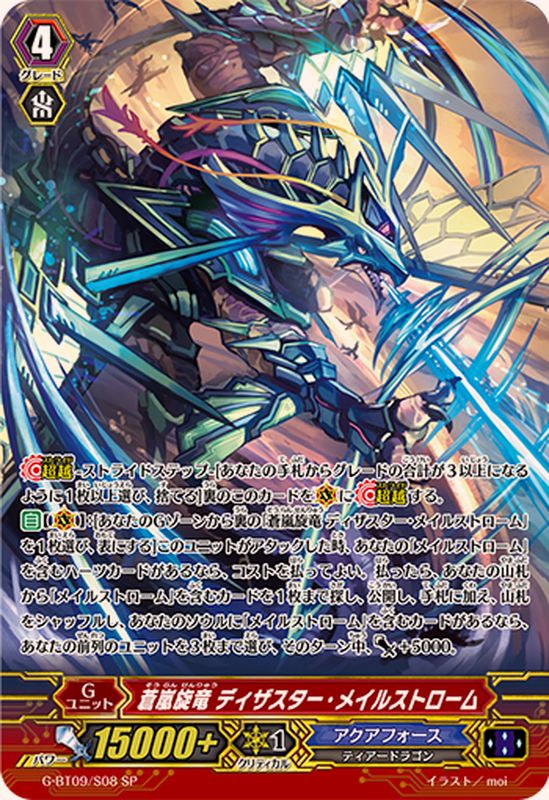【超越】-ストライドステップ-[あなたの手札からグレードの合計が3以上になるように1枚以上選び、捨てる]裏のこのカードを(V)に【超越】する。【自】【(V)】:[あなたのGゾーンから裏の「蒼嵐旋竜 ディザスター・メイルストローム」を1枚選び、表にする]このユニットがアタックした時、あなたの「メイルストローム」を含むハーツカードがあるなら、コストを払ってよい。払ったら、あなたの山札から「メイルストローム」を含むカードを1枚まで探し、公開し、手札に加え、山札をシャッフルし、あなたのソウルに「メイルストローム」を含むカードがあるなら、あなたの前列のユニットを3枚まで選び、そのターン中、パワー+5000。