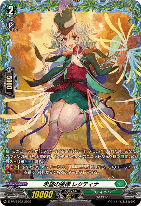 【自】:このユニットが「リアノーン」を含むグレード3にライドされた時、あなたのヴァンガードを1枚選び、そのターン中、そのユニットが元々持つ【自】能力のコストは【カウンターブラスト】(1)減る。【永】【(R)】:あなたのヴァンガードが【ユニゾンドレス】状態なら、このユニットは『ブースト』を得て、後列からでもインターセプトできる。