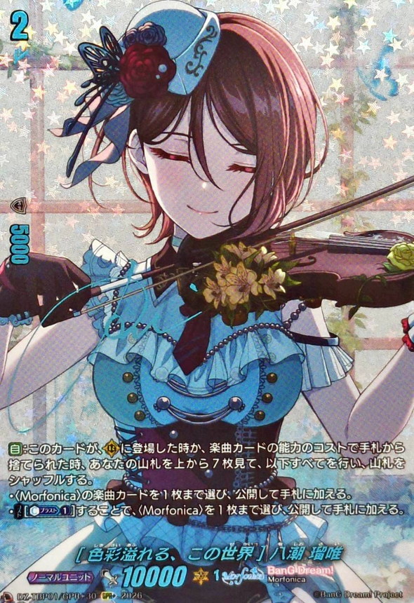【自】:このカードが、(R)に登場した時か、楽曲カードの能力のコストで手札から捨てられた時、あなたの山札を上から7枚見て、以下すべてを行い、山札をシャッフルする。・〈Morfonica〉の楽曲カードを1枚まで選び、公開して手札に加える。・【コスト】[【カウンターブラスト】(1)]することで、〈Morfonica〉を1枚まで選び、公開して手札に加える。