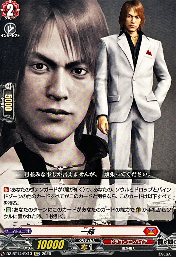 【永】:あなたのヴァンガードが〈龍が如く〉で、あなたの、ソウルとドロップとバインドゾーンの他のカードすべてがこのカードと別名なら、このカードは以下すべてを得る。・【自】:あなたのターンにこのカードがあなたのカードの能力で(R)か手札からソウルに置かれた時、1枚引く。