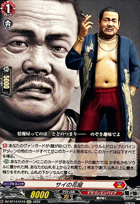 【永】:あなたのヴァンガードが〈龍が如く〉で、あなたの他の、ソウルとドロップとバインドゾーンすべてがこのカードと別名なら、このカードは以下すべてを得る。・【自】:あなたのターンにこのカードがあなたのカードの能力で(R)か手札からソウルに置かれた時、あなたの山札を上から2枚見て、1枚まで選び、山札の上に置き、残りをそれぞれ、山札の下かソウルに置く。